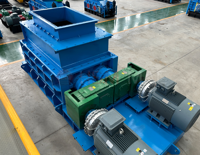 強力分級破碎機在破碎腔內裝置兩個水平安裝且相互平行的齒輥,齒輥表面有破碎齒,齒輥通過傳動裝置(單電機傳動或雙電機傳動)相互轉動,依靠沖擊剪切和沖擊拉伸的作用,使剪切力沿著物料的薄弱易碎部位產生巨大破碎力使其破碎。物料在兩個破碎輥之間以及與側壁的梳齒板之間排出,產品在破碎后受此間隙控制,不會產生過大顆粒,而且在給料中原本已含有合格粒度的物料也會很快排出,避免重復破碎。減小出粉率增大產量。